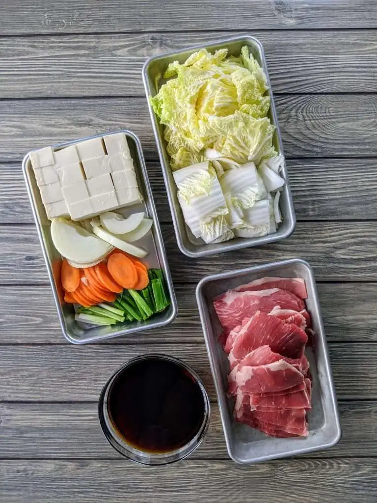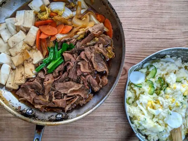 This sweet and savory one-pot meal of beef, tofu, and vegetables is Japanese Sukiyaki. This dish is good right after cooking but can be reheated and enjoyed later.