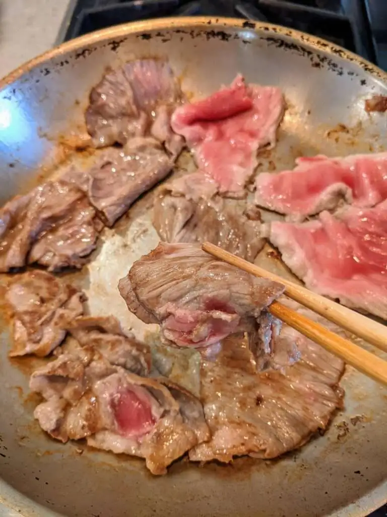 When the pan is hot and almost smoky, add cooking oil and sear beef, preferably without overcrowding the pan.